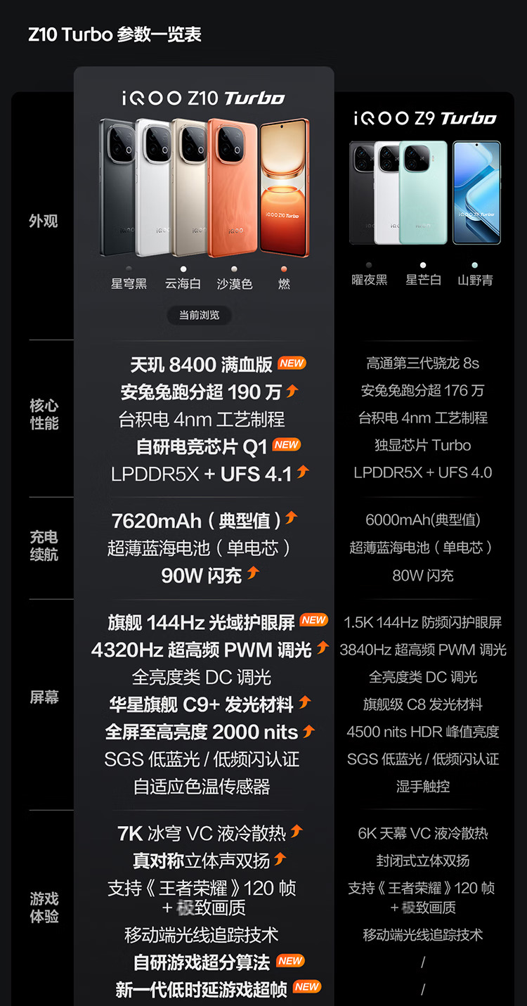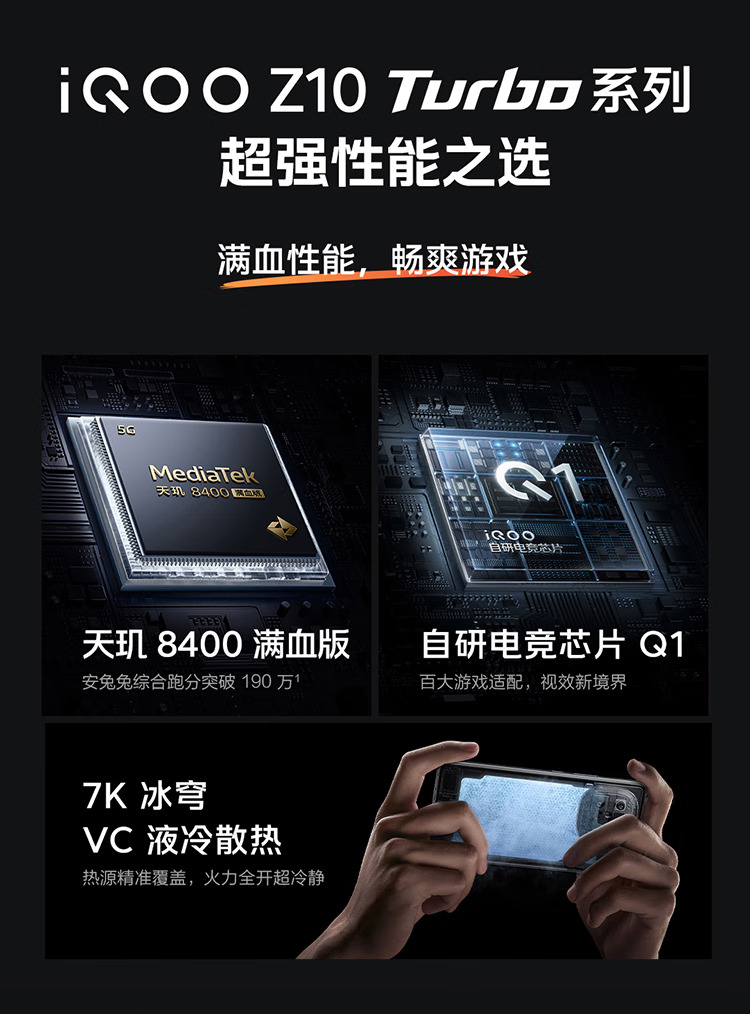 iQOO Z10 Turbo 12GB+256GB 燃 天玑8400满血版 · 自研电竞芯片 Q1 · 7620mAh超薄蓝海电池 · 旗舰144Hz光域护眼屏